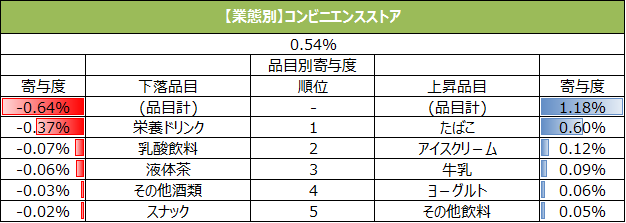 また、直近週の単価指数について、上昇、下落の寄与度上位5品目を業態別に集計しています。