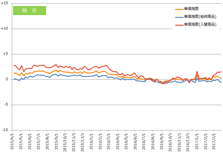 単価指数については、継続商品、入替商品の2区分で傾向変化を確認いただくことが可能です。
