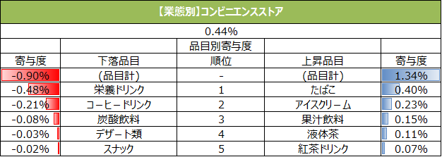 また、直近週の単価指数について、上昇、下落の寄与度上位5品目を業態別に集計しています。