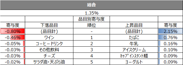 また、直近週の単価指数について、上昇、下落の寄与度上位5品目を業態別に集計しています。