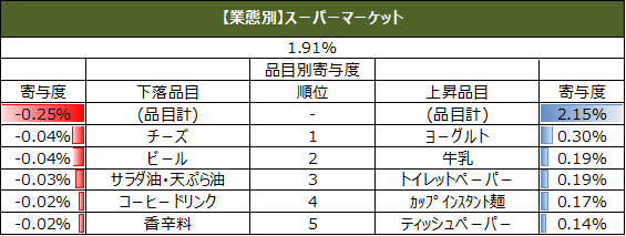 また、直近週の単価指数について、上昇、下落の寄与度上位5品目を業態別に集計しています。