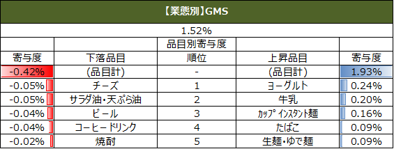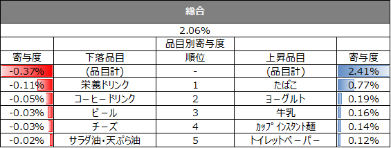 また、直近週の単価指数について、上昇、下落の寄与度上位5品目を業態別に集計しています。