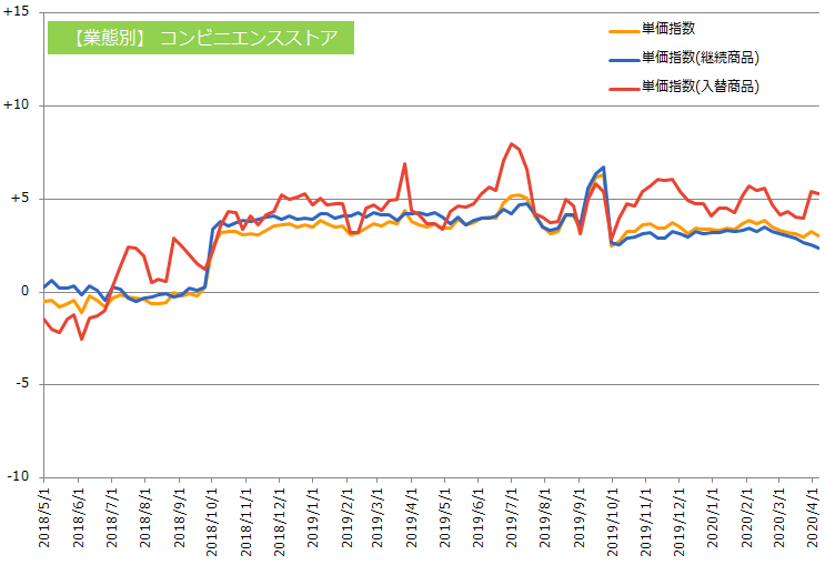 単価指数については、継続商品、入替商品の2区分で傾向変化を確認いただくことが可能です。