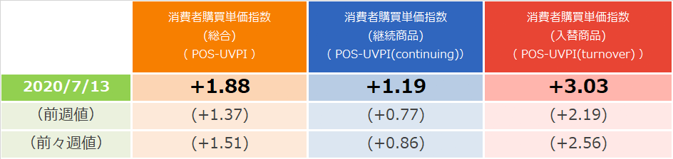 単価指数については、継続商品、入替商品の2区分で傾向変化を確認いただくことが可能です。