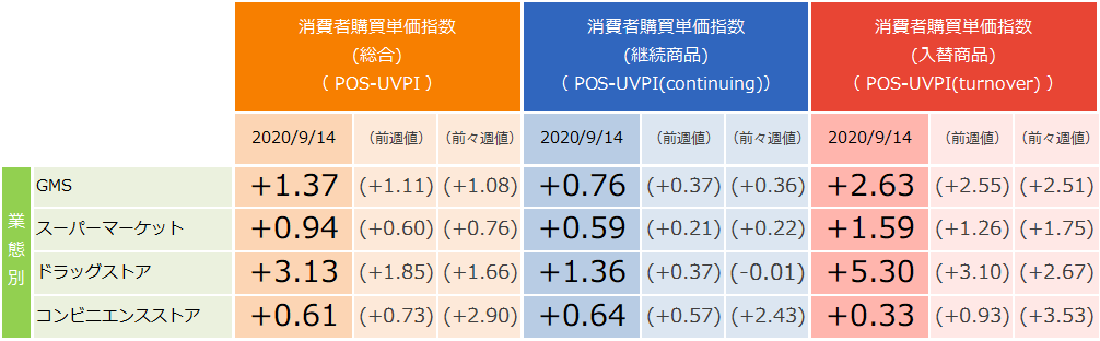 単価指数については、継続商品、入替商品の2区分で傾向変化を確認いただくことが可能です。