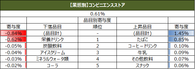 また、直近週の単価指数について、上昇、下落の寄与度上位5品目を業態別に集計しています。