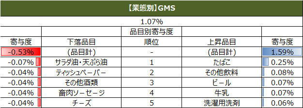 また、直近週の単価指数について、上昇、下落の寄与度上位5品目を業態別に集計しています。