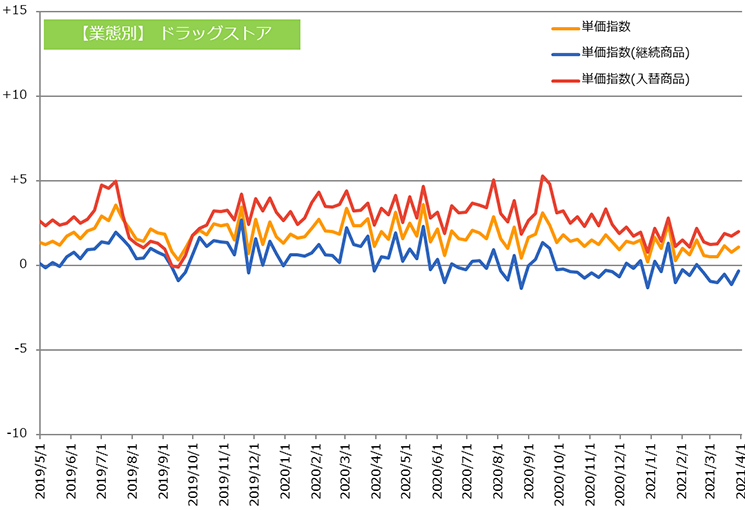 単価指数については、継続商品、入替商品の2区分で傾向変化を確認いただくことが可能です。