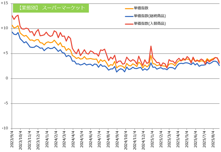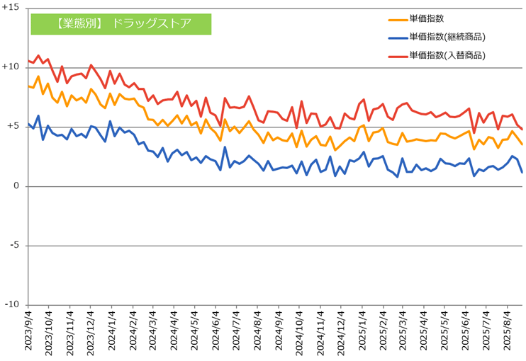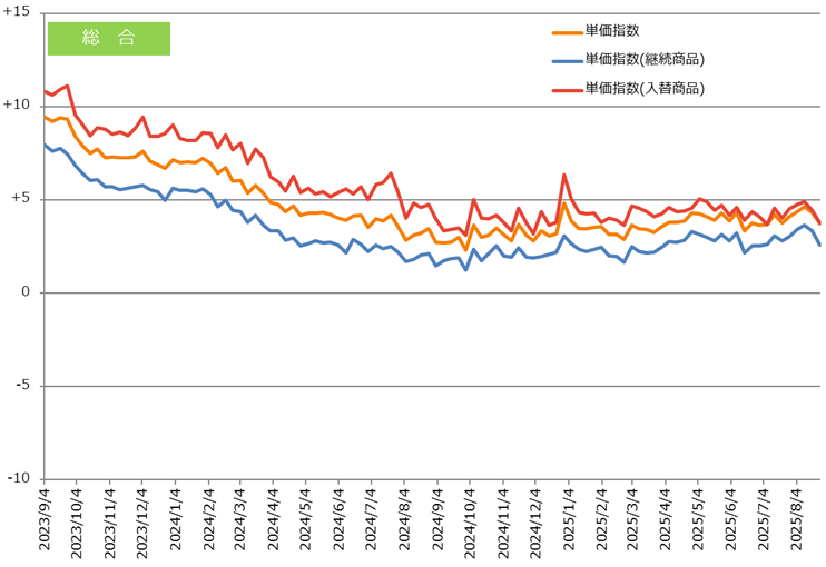 単価指数については、継続商品、入替商品の2区分で傾向変化を確認いただくことが可能です。
