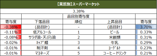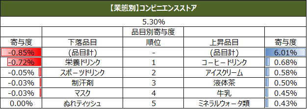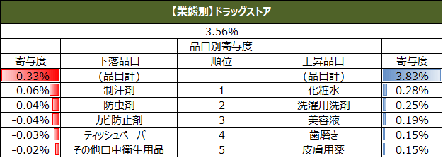 また、直近週の単価指数について、上昇、下落の寄与度上位5品目を業態別に集計しています。