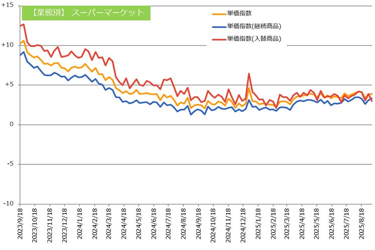 単価指数については、継続商品、入替商品の2区分で傾向変化を確認いただくことが可能です。
