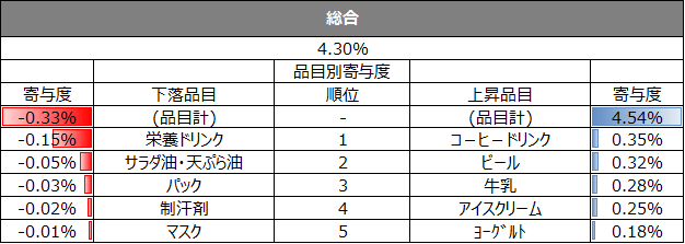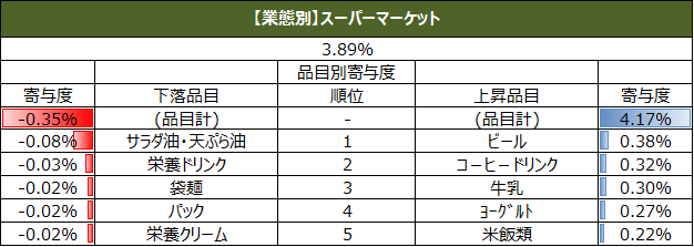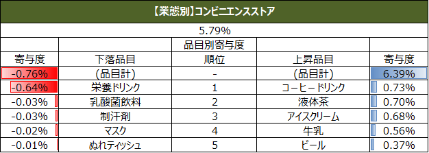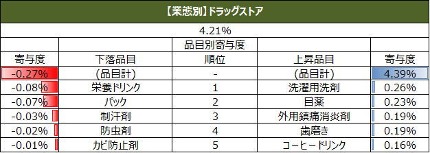 また、直近週の単価指数について、上昇、下落の寄与度上位5品目を業態別に集計しています。