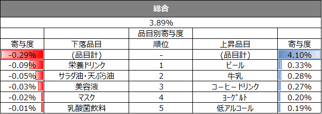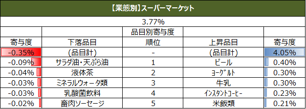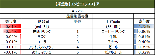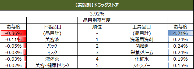 また、直近週の単価指数について、上昇、下落の寄与度上位5品目を業態別に集計しています。