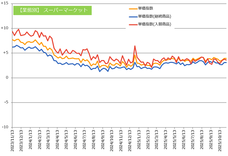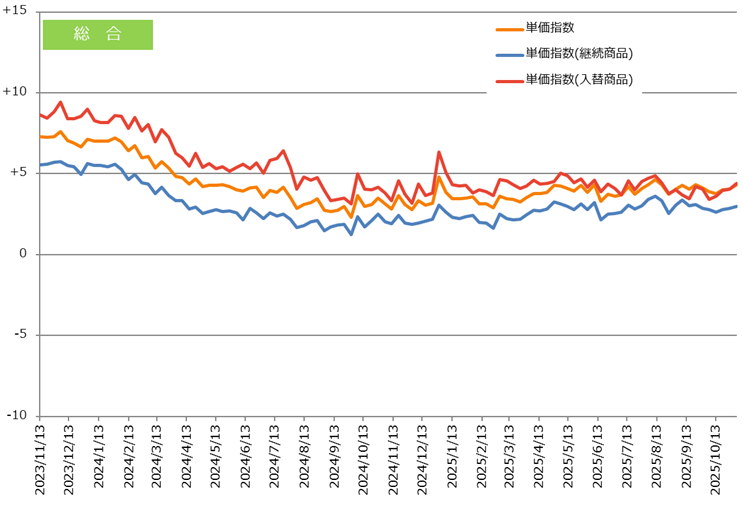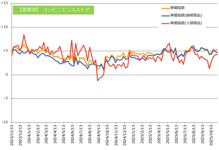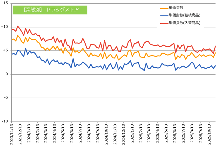 単価指数については、継続商品、入替商品の2区分で傾向変化を確認いただくことが可能です。