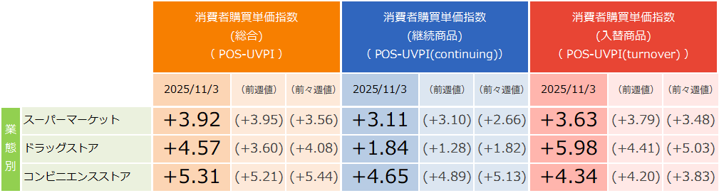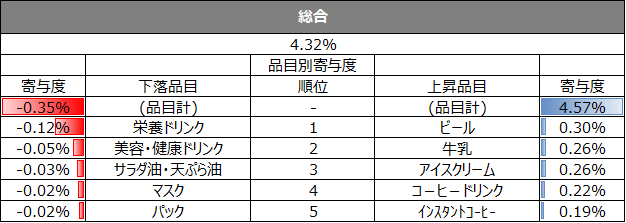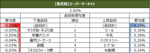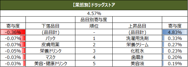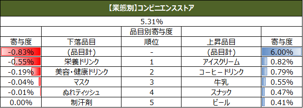 また、直近週の単価指数について、上昇、下落の寄与度上位5品目を業態別に集計しています。