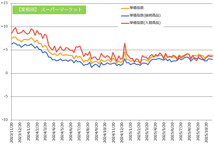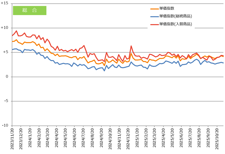 単価指数については、継続商品、入替商品の2区分で傾向変化を確認いただくことが可能です。