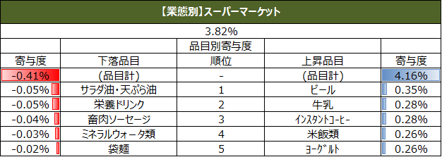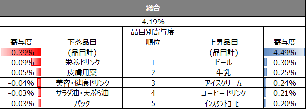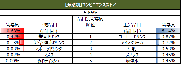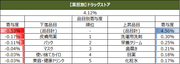 また、直近週の単価指数について、上昇、下落の寄与度上位5品目を業態別に集計しています。