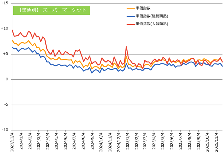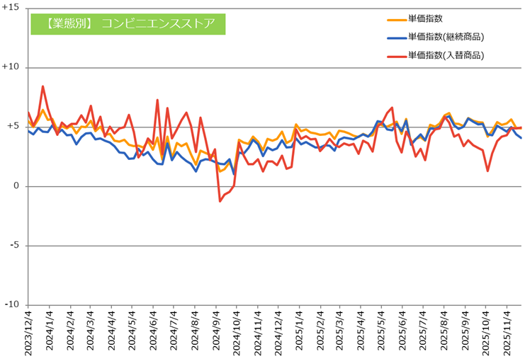 単価指数については、継続商品、入替商品の2区分で傾向変化を確認いただくことが可能です。