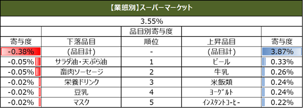 また、直近週の単価指数について、上昇、下落の寄与度上位5品目を業態別に集計しています。