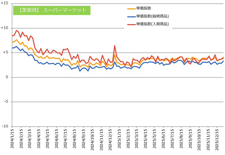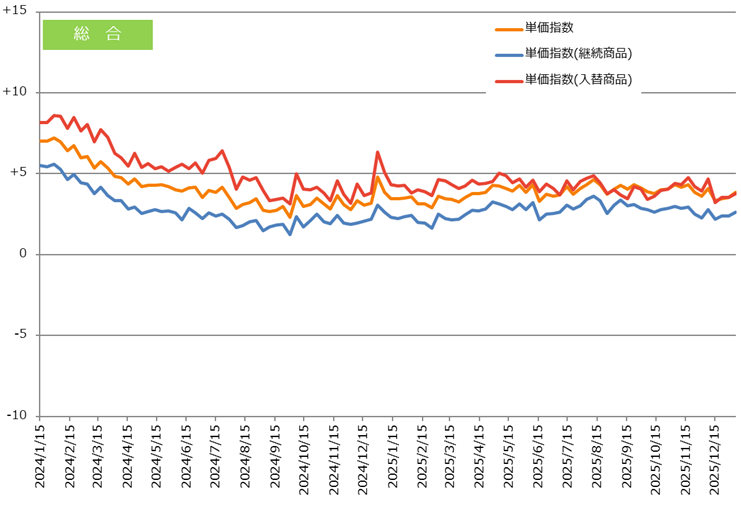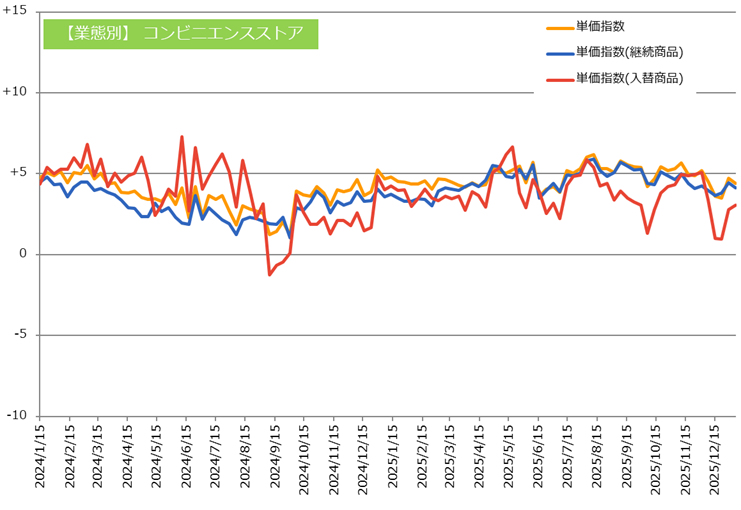 単価指数については、継続商品、入替商品の2区分で傾向変化を確認いただくことが可能です。