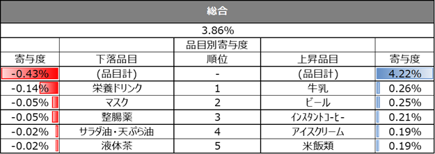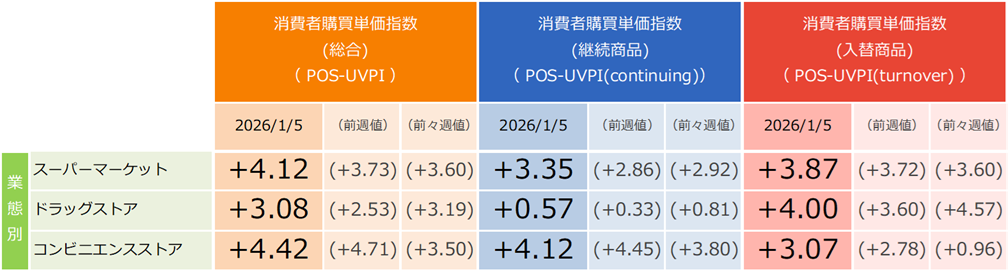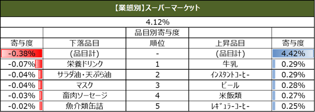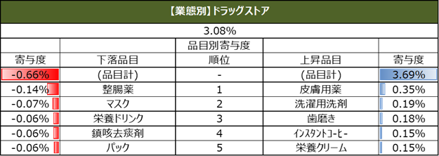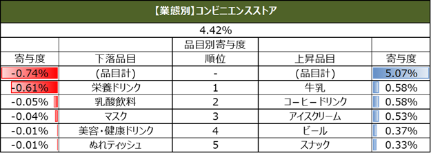 また、直近週の単価指数について、上昇、下落の寄与度上位5品目を業態別に集計しています。