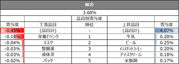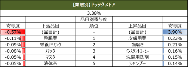 また、直近週の単価指数について、上昇、下落の寄与度上位5品目を業態別に集計しています。