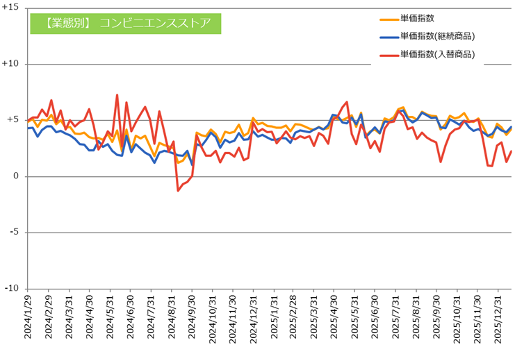 単価指数については、継続商品、入替商品の2区分で傾向変化を確認いただくことが可能です。