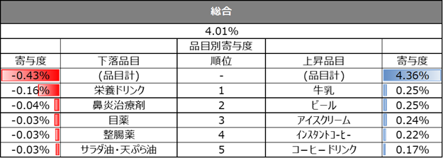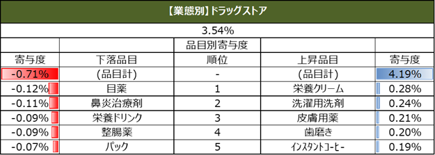 また、直近週の単価指数について、上昇、下落の寄与度上位5品目を業態別に集計しています。