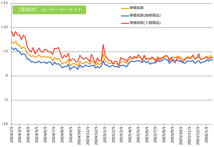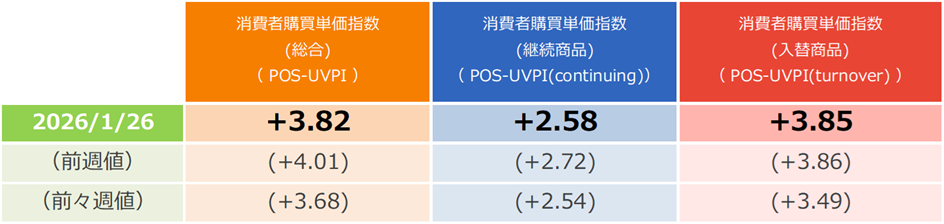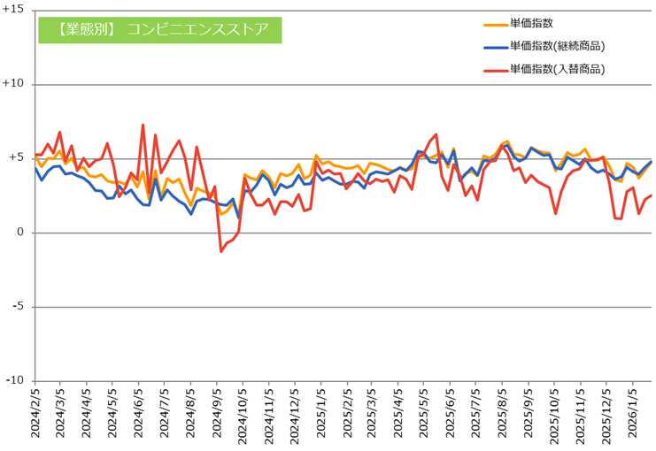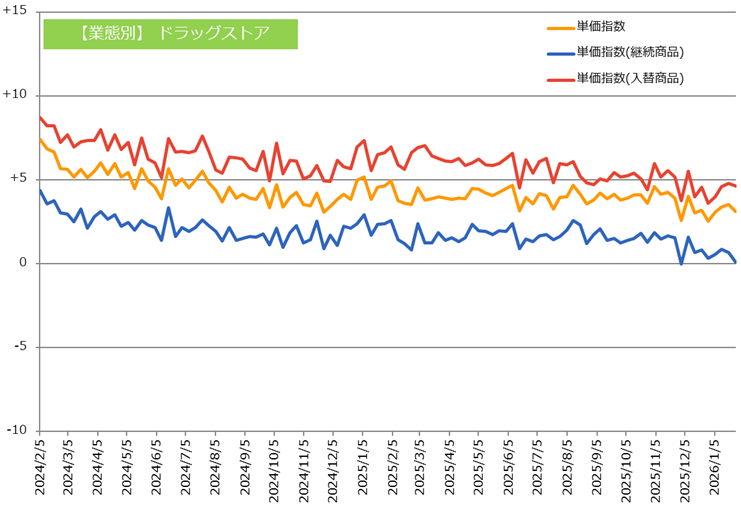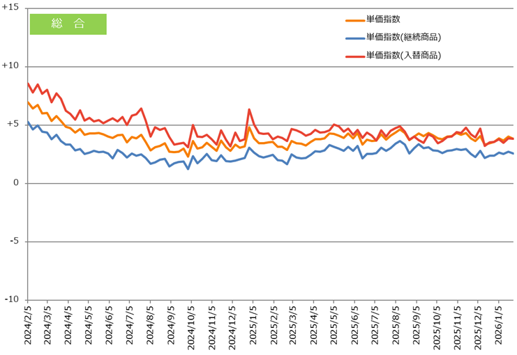 単価指数については、継続商品、入替商品の2区分で傾向変化を確認いただくことが可能です。
