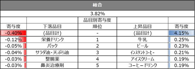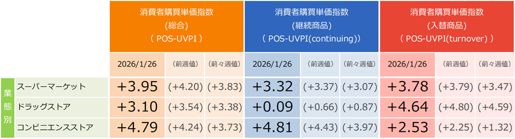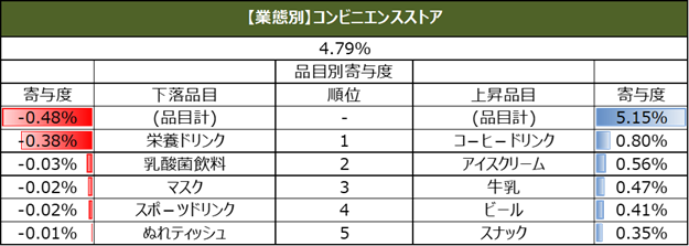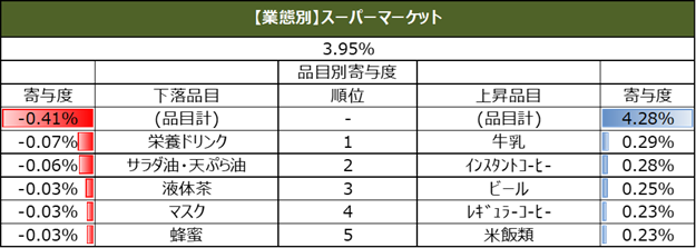 また、直近週の単価指数について、上昇、下落の寄与度上位5品目を業態別に集計しています。