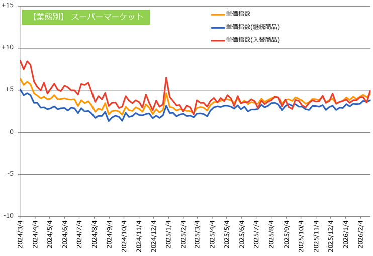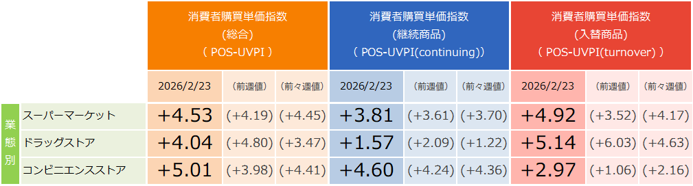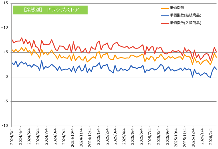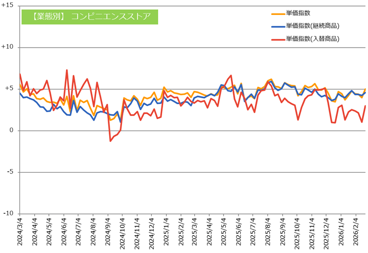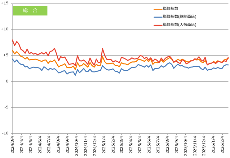 単価指数については、継続商品、入替商品の2区分で傾向変化を確認いただくことが可能です。