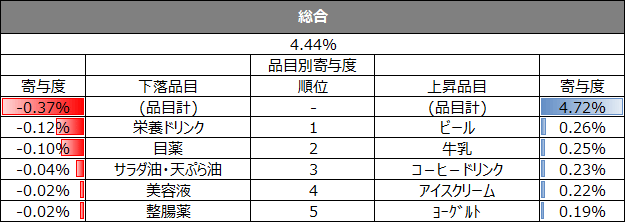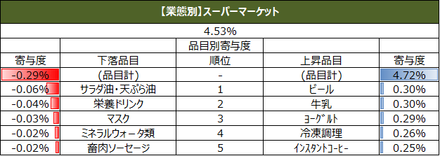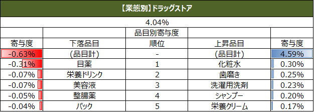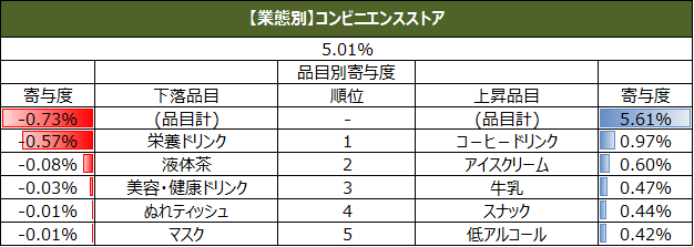 また、直近週の単価指数について、上昇、下落の寄与度上位5品目を業態別に集計しています。