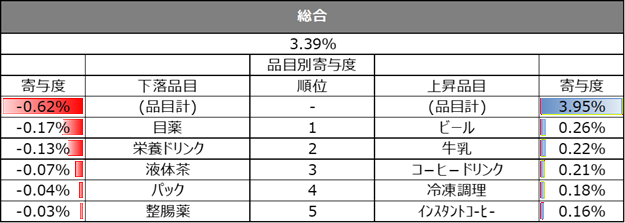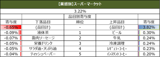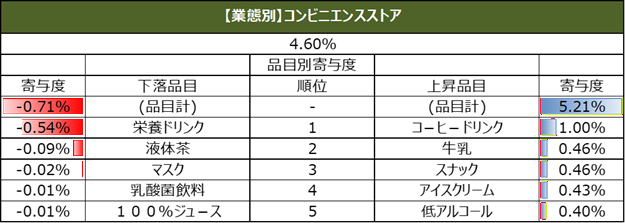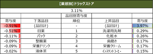 また、直近週の単価指数について、上昇、下落の寄与度上位5品目を業態別に集計しています。